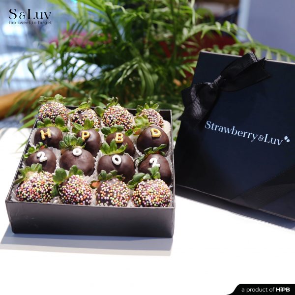 Hộp 16 trái trong Socola đen, 4 hàng dâu được sắp xếp có hàng chữ HPBD kèm theo 4 con số sinh nhật bằng fondant màu trắng, 8 trái còn lại đính kẹo bi nhiều màu. Được trình bày trong một hộp quà hấp dẫn, món quà dành cho người sành ăn này sẽ giúp bạn tạo ra một tình cảm tuyệt vời cho ngày sinh nhật của người thân yêu.